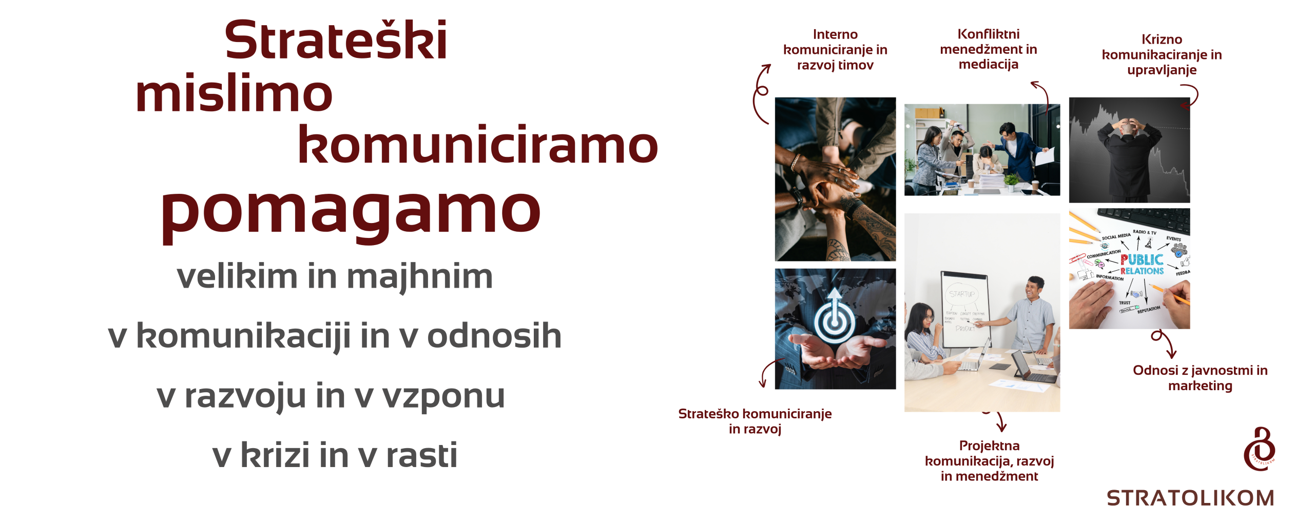 Podjetjem in organizacijam vseh velikosti ponujam celovit nabor učinkovitih naprednih strateških komunikacijskih storitev – od interne, b2b in krizne komunikacije, konfliktnega menedžmenta, mediacije in pogajanja, odnosov z javnostmi in mediji, pisanja in urejanja poslovnih, medijskih, strokovnih in marketinških vsebin in predstavitev, vse do organizacije poslovnih, izobraževalnih, strokovnih in kulturnih srečanj in dogodkov in vrhunskih strateških, komunikacijskih ali zabavnih teambuildingov za vaše podjetje.